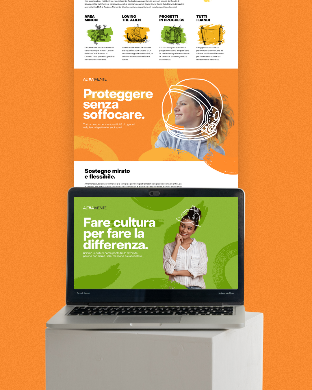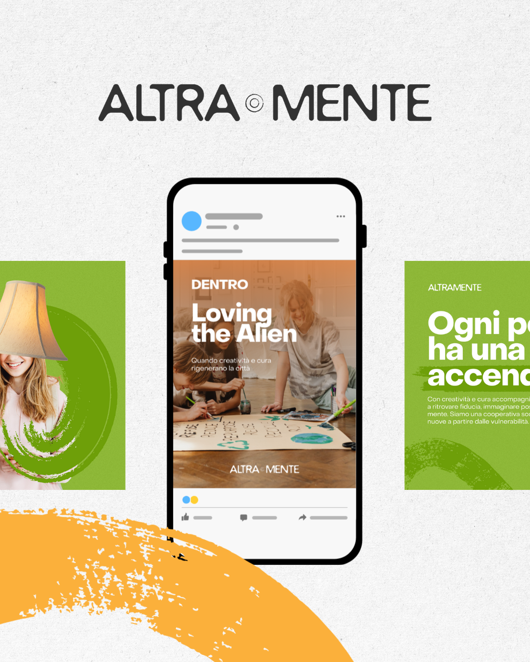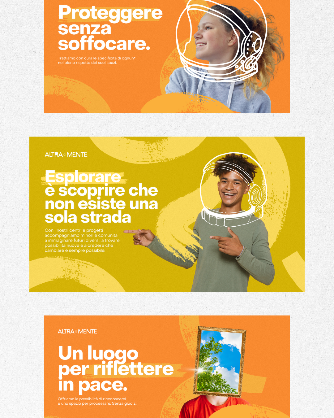 Altra Mente works closely with young people in vulnerable conditions. Their brand identity evolved with the careful guide of Punto Zero studio. New keyvisuals and social media templates were developed accordingly.