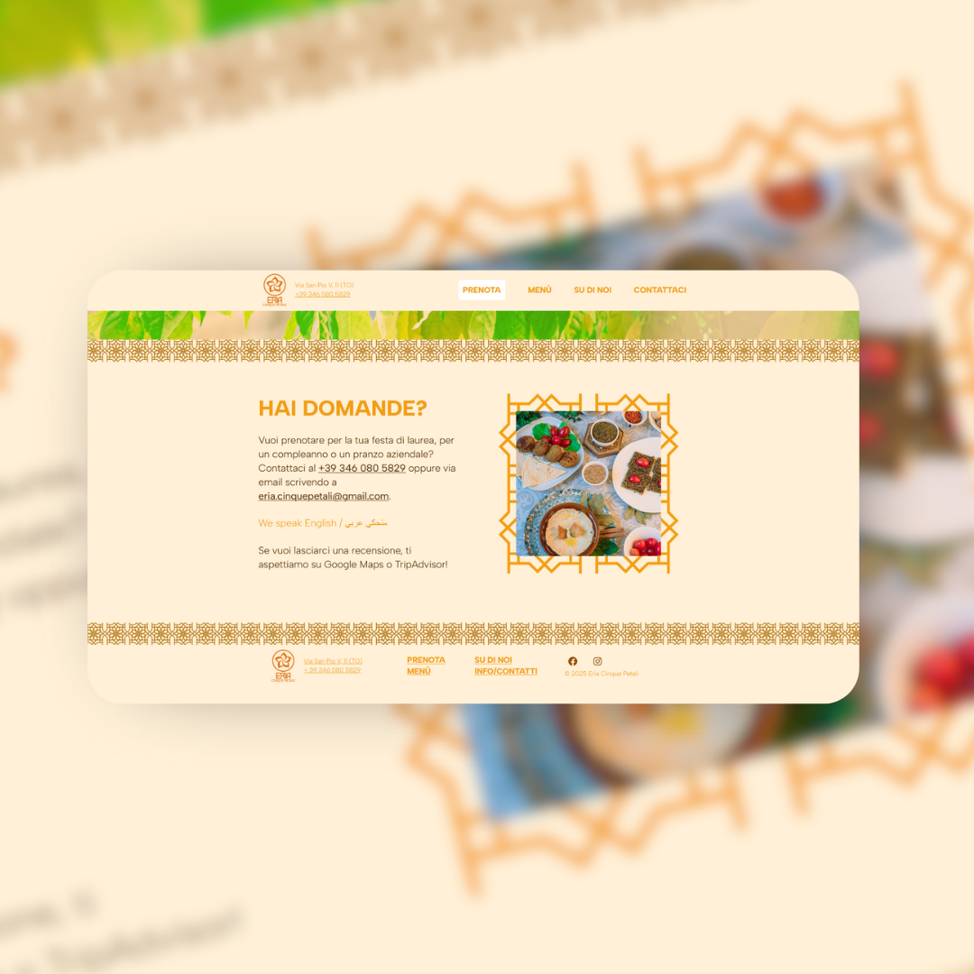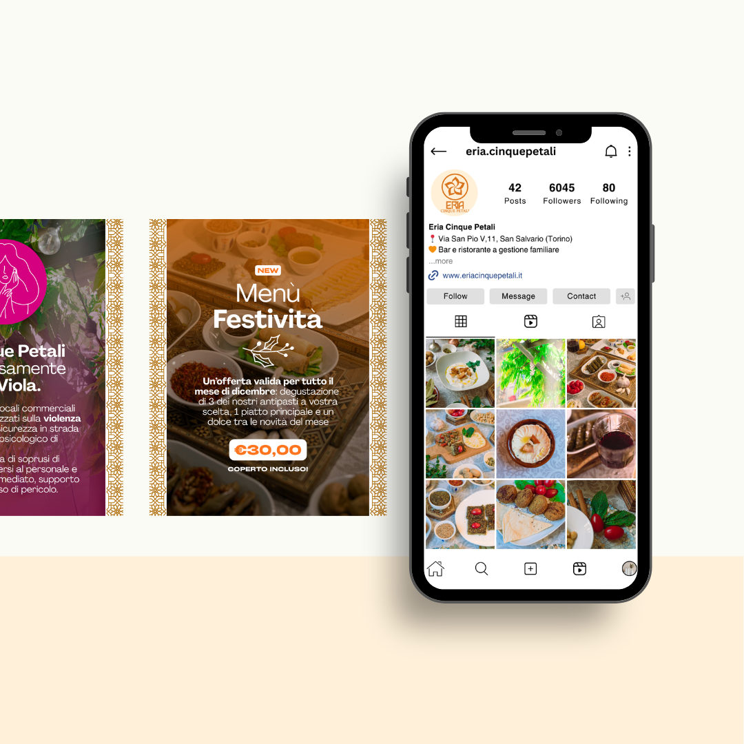 Eria Cinque Petali is a family restaurant in the popular neighbourhood of Turin, Italy. After a thorough exploration of the core values of the activity, involving managers and employees, the branding and website were developed reflecting a down-to-earth, delicate and warm identity. The project included refreshing the business’ social media presence, including Instagram and Facebook, and preparing social media templates for their editorial plan.