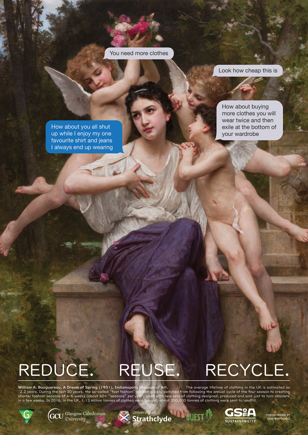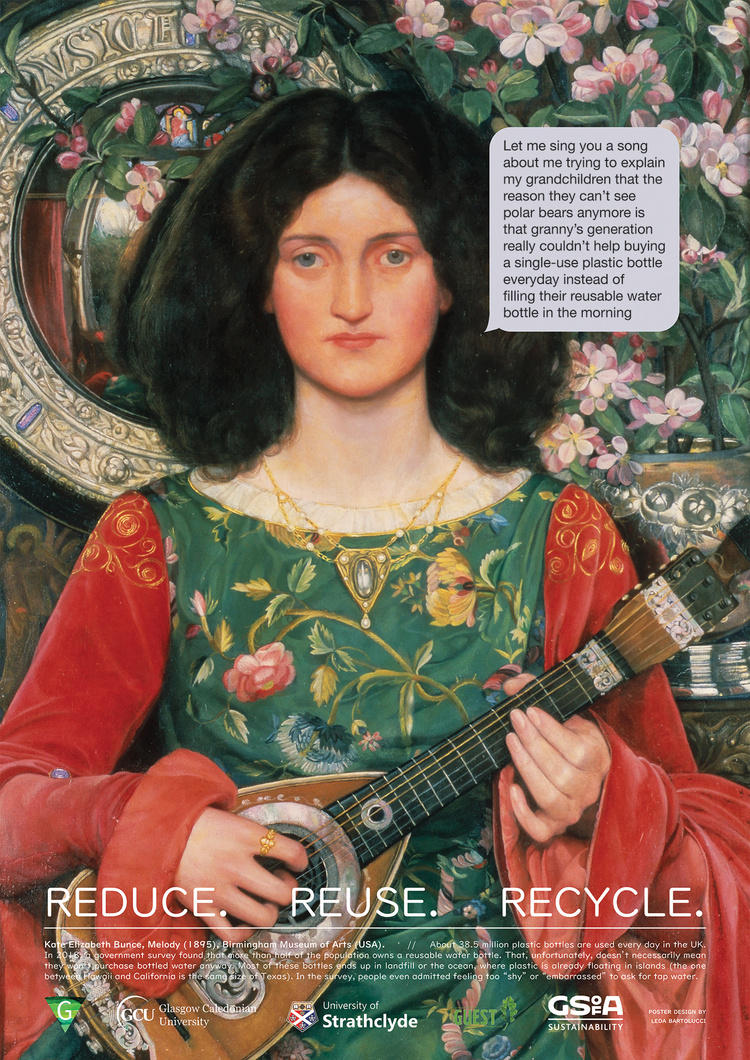 Series of posters that combine paintings and stereotypical phone texts to raise awareness about the pollution issue and its several solutions: reducing consumption, reusing items, and recycling waste. The themes chosen were paired with an in-depth research whose outcome was resumed in the captions at the bottom. All the sources were then published online.