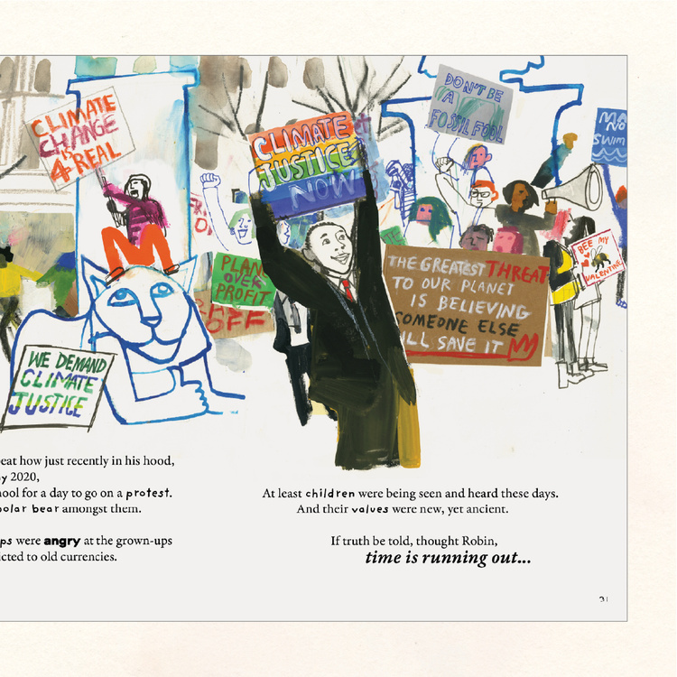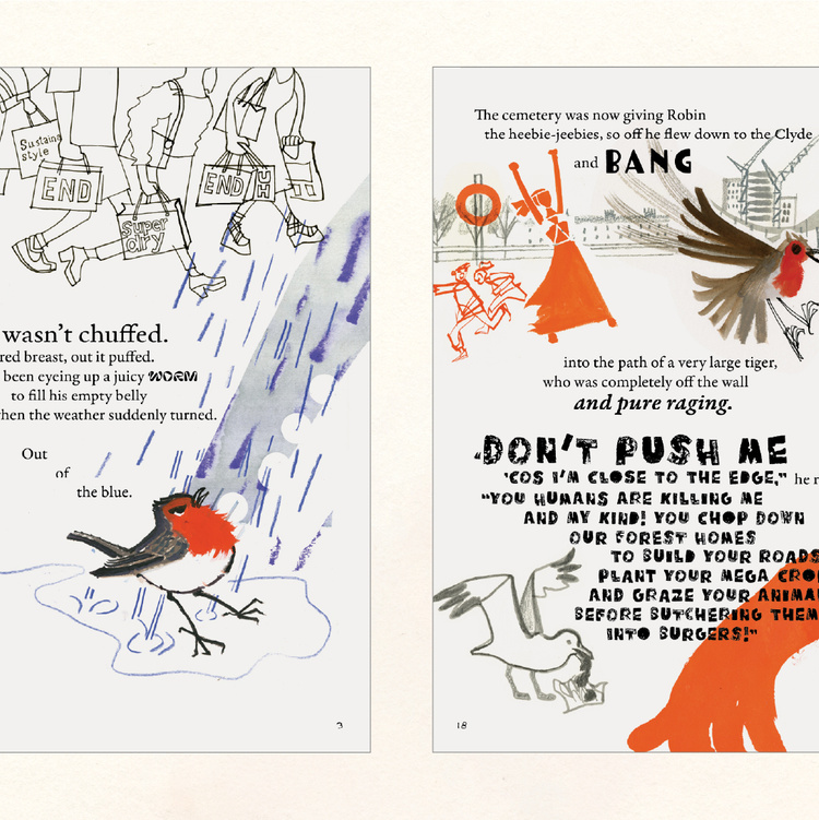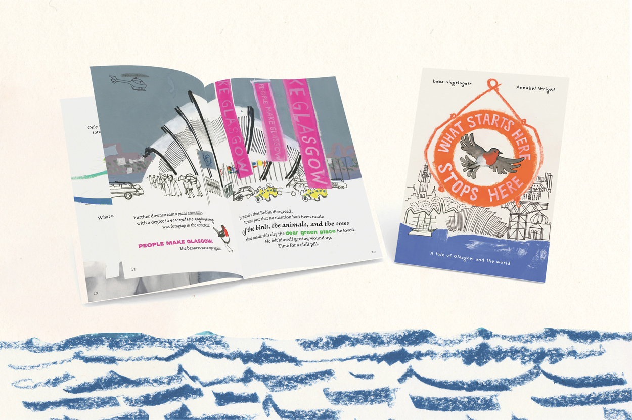 The city of Glasgow hosted COP26 in November 2021. The city’s involvement in the history of the planet and climate change, however, is way older. In this children’s book we follow a wee robin on a journey of discovery through time, from the old Glasgow until the contemporary one. Illustrations by Annabel Wright, story by babs nicgriogair, editing by Sapna Agarwal. Published by Hope Street Collective and Aye Aye Books.